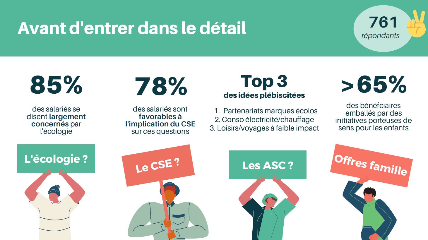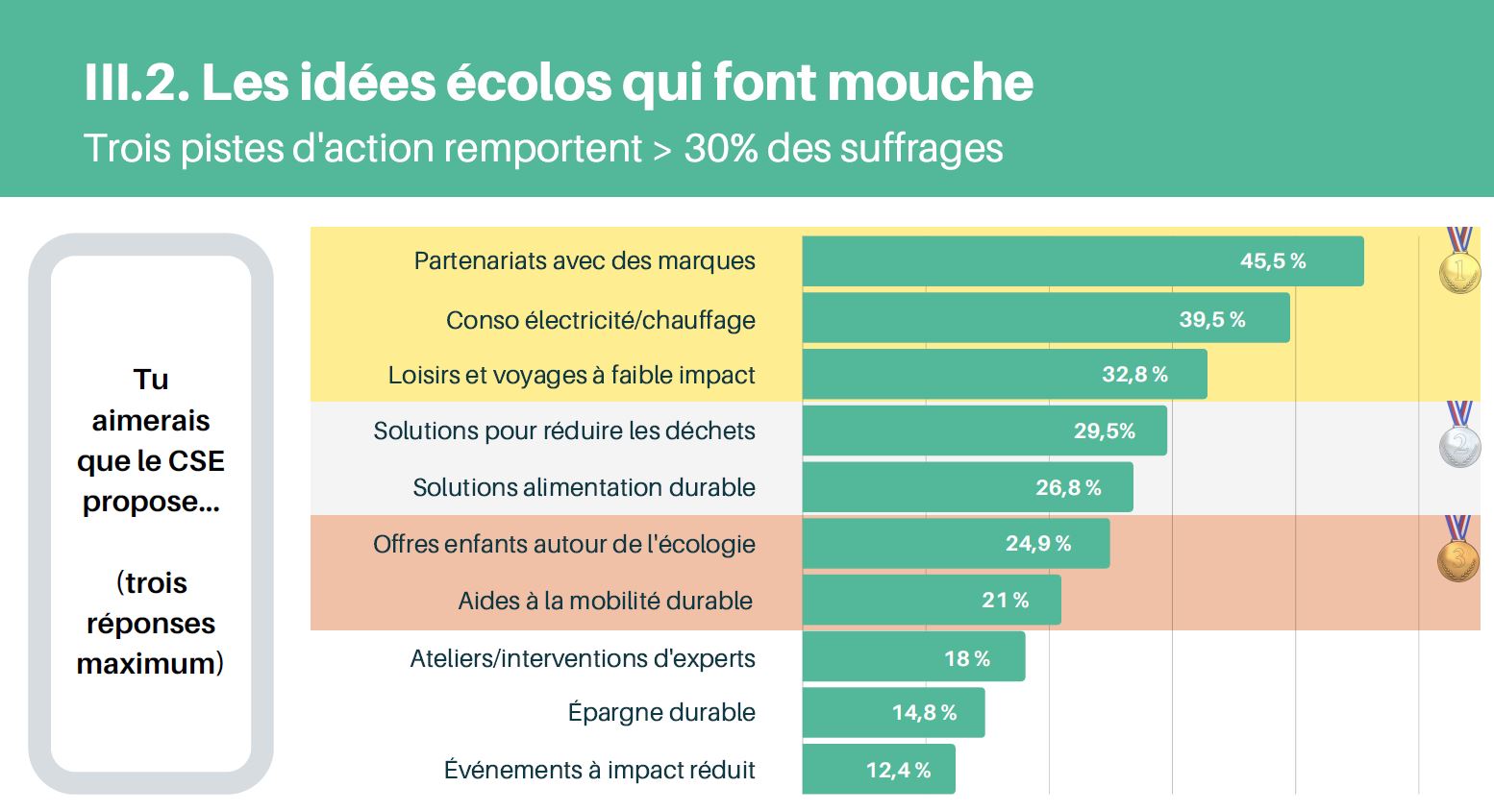 Les principaux enseignements de cette enquête montrent que les salarié·e·s sont conscient·e·s du défi lié à l’environnement et que le CSEM doit s’approprier le sujet. Les propositions à traiter en priorité par le CSEM concernent les enfants, les aides pour le quotidien et les loisirs responsables.